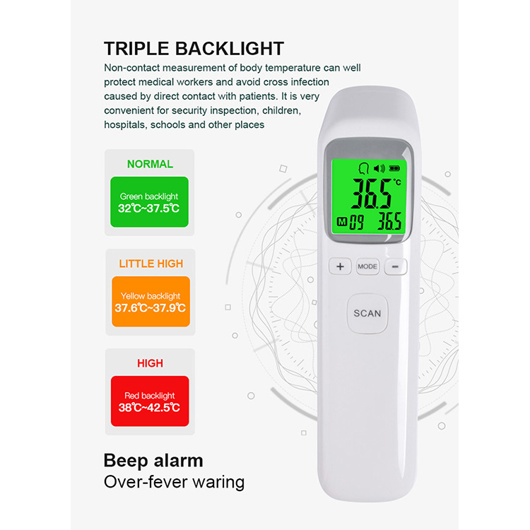 تم تصميم مسدس ميزان الحرارة الرقمي بالأشعة تحت الحمراء لقياس درجة حرارة جسم الإنسان. إنه بسيط للغاية ومريح للاستخدام. قياس دقيق لدرجة الحرارة لمدة ثانية واحدة ، بدون نقطة ليزر ، تجنب الأضرار المحتملة للعينين ، لا تحتاج إلى ملامسة جلد الإنسان ، وتجنب العدوى المتقاطعة ، وقياس درجة الحرارة على زر واحد ، وفحص الأنفلونزا. مناسبة لمستخدمي الأسرة والفنادق والمكتبات والمؤسسات والمؤسسات الكبيرة ، ويمكن استخدامها أيضًا في المستشفيات والمدارس والجمارك والمطارات والأماكن الشاملة الأخرى ، ويمكن أيضًا توفيرها للموظفين الطبيين في استخدام العيادة.